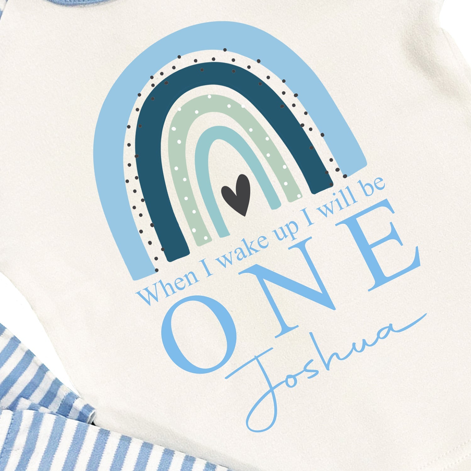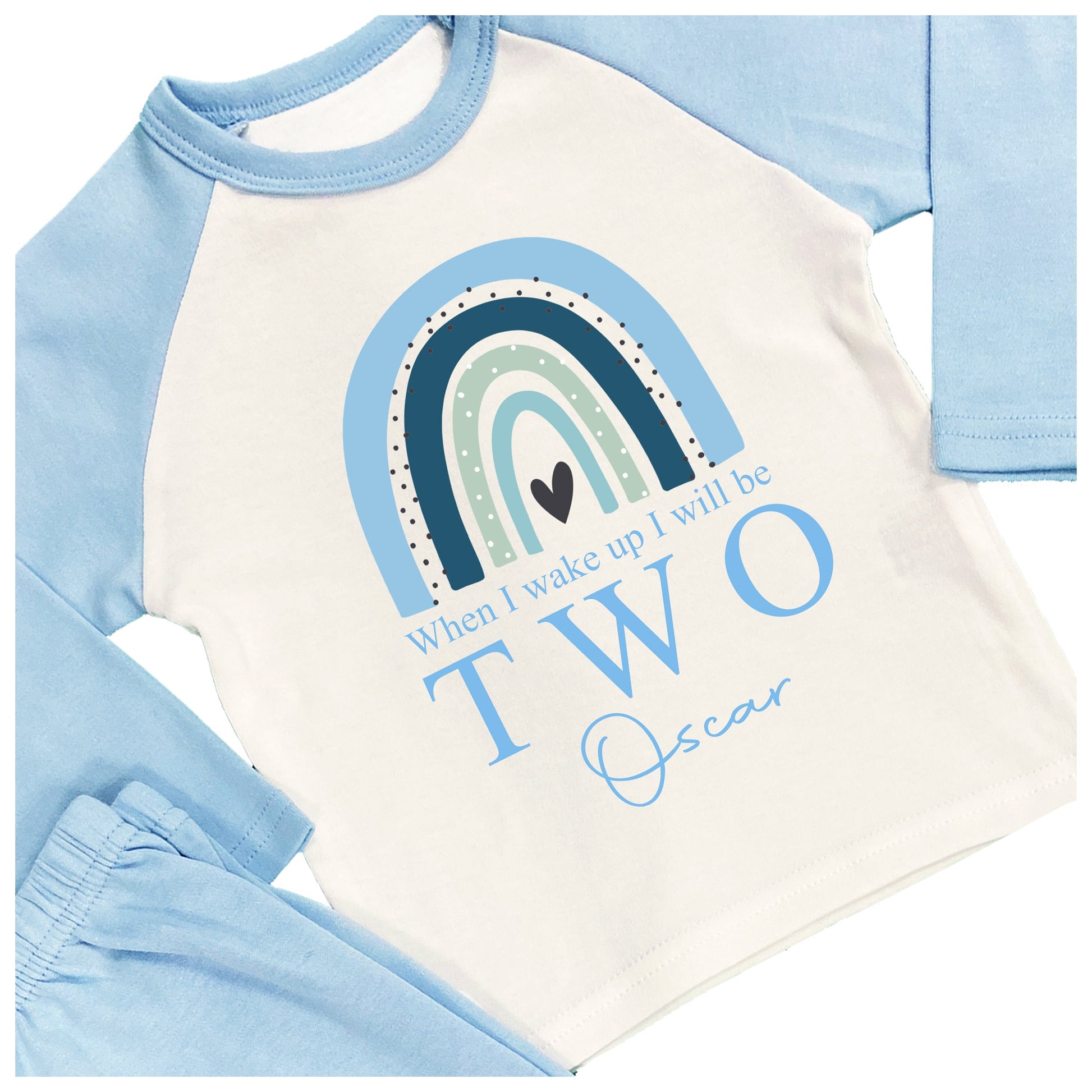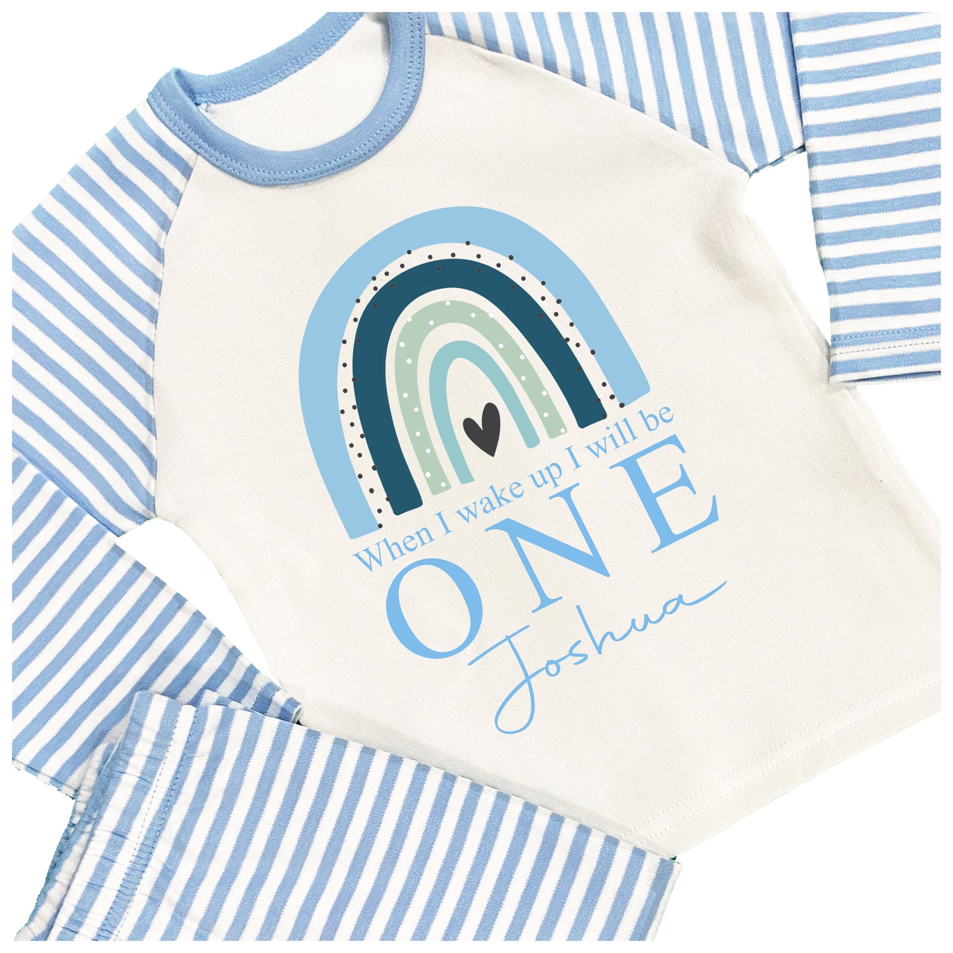 The boys rainbow pyjamas are available in blue plain or striped and will be personalised with the name and age.