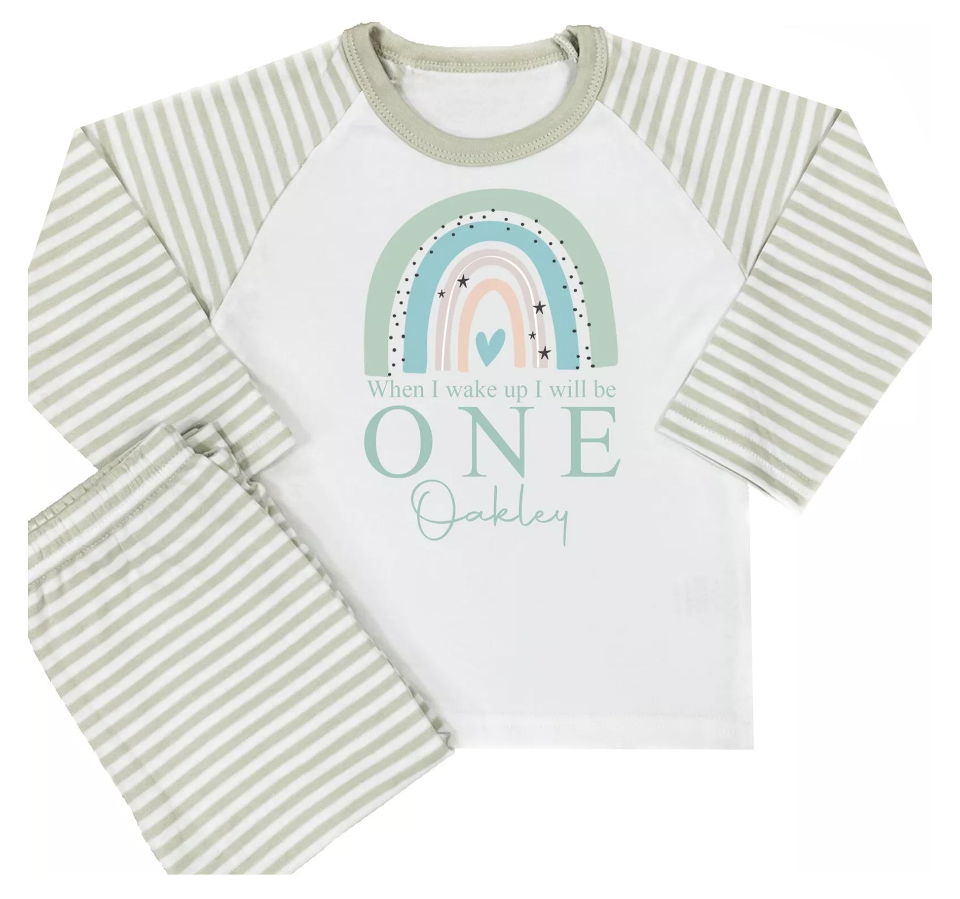 Make their birthday extra special with our delightful Personalised Birthday Pyjamas in Sage Green from The Baby Box UK. Featuring a lively rainbow design, these pyjamas bring joy and excitement to his birthday festivities.
