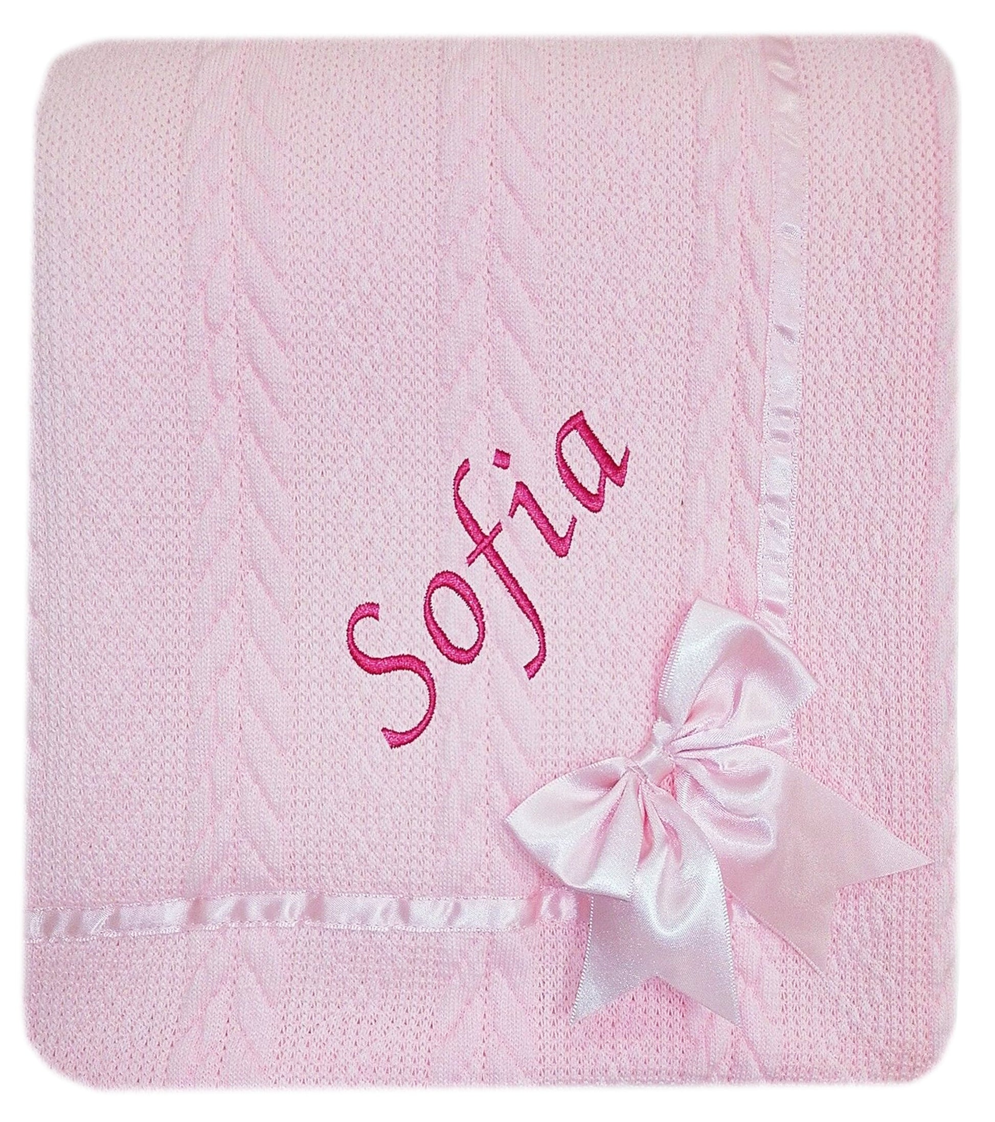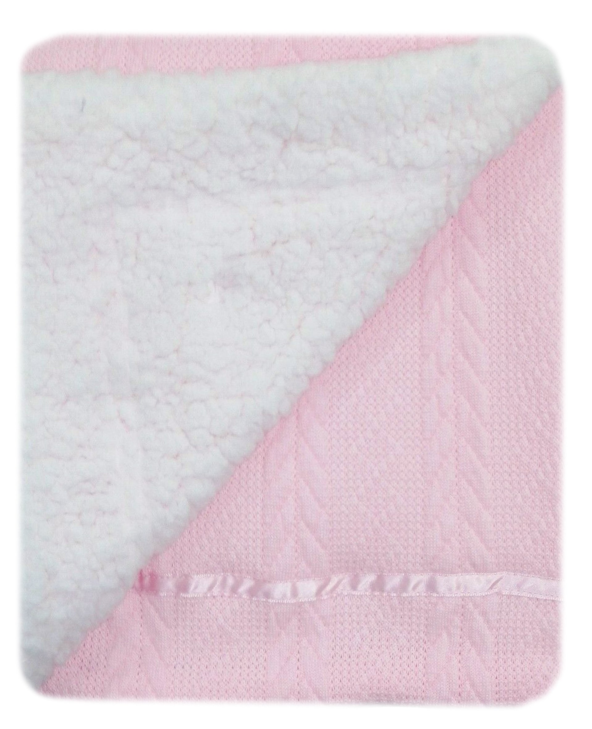 This pink cable knit blanket has a wonderfully soft Sherpa backing and is finished with a lovely little bow.