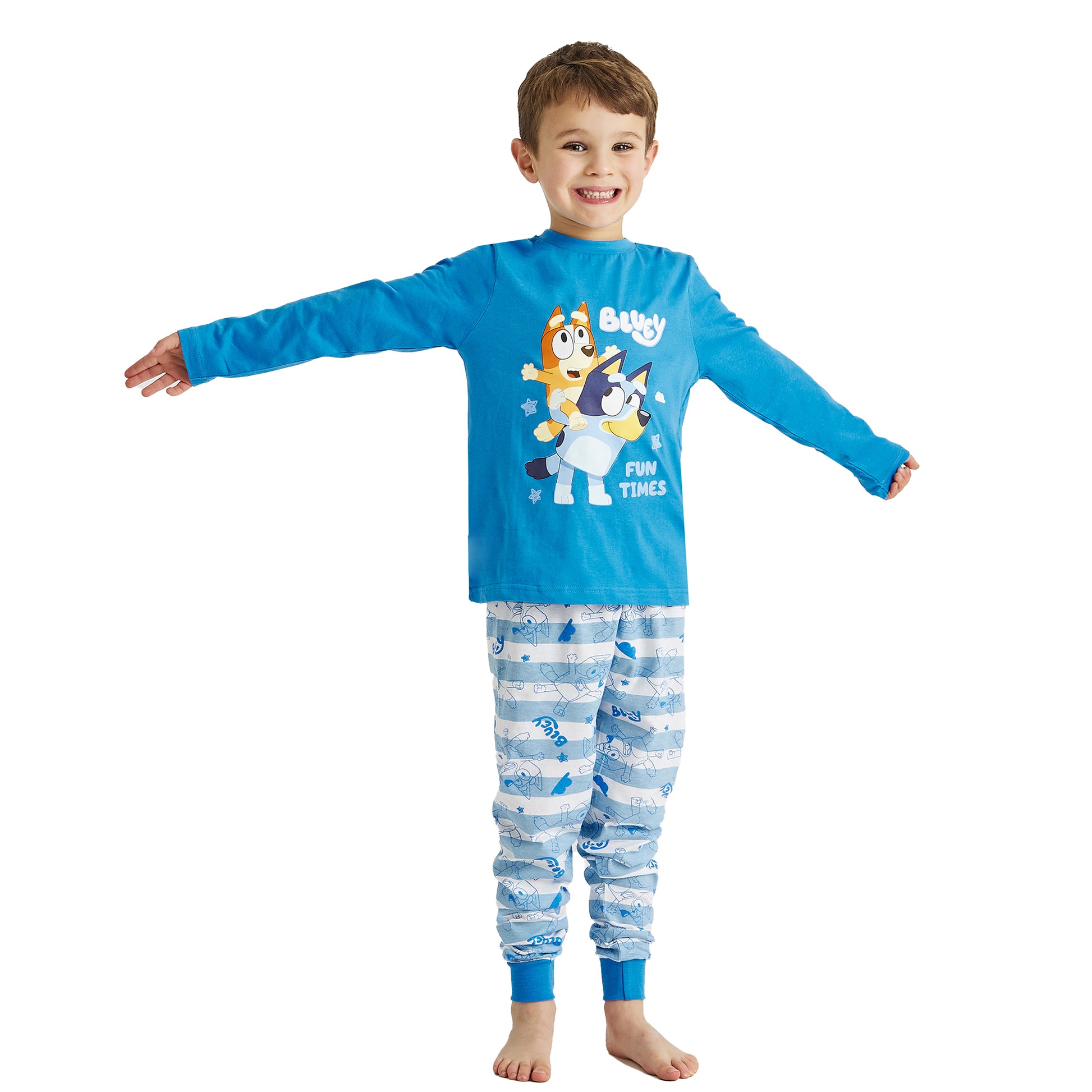 The Bluey pyjama set come with a long sleeved top, with patterned pyjama bottoms. Featuring Bluey and Bingo characters to the pyjama top and bottoms, with the words "Fun Times".