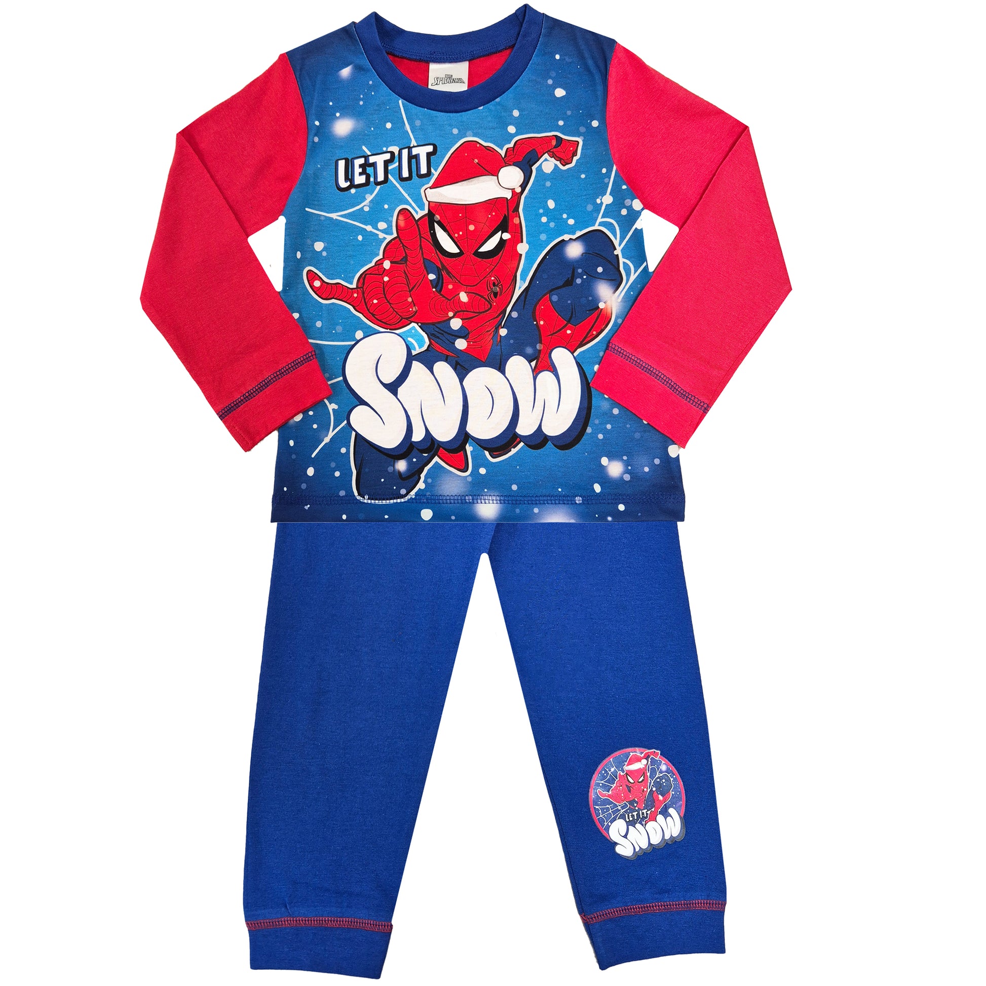 The Spiderman pyjamas have a long sleeved top with the iconic Spiderman character to the front, with a snowy festive theme. The Spiderman pyjamas also come with matching pyjama bottoms.