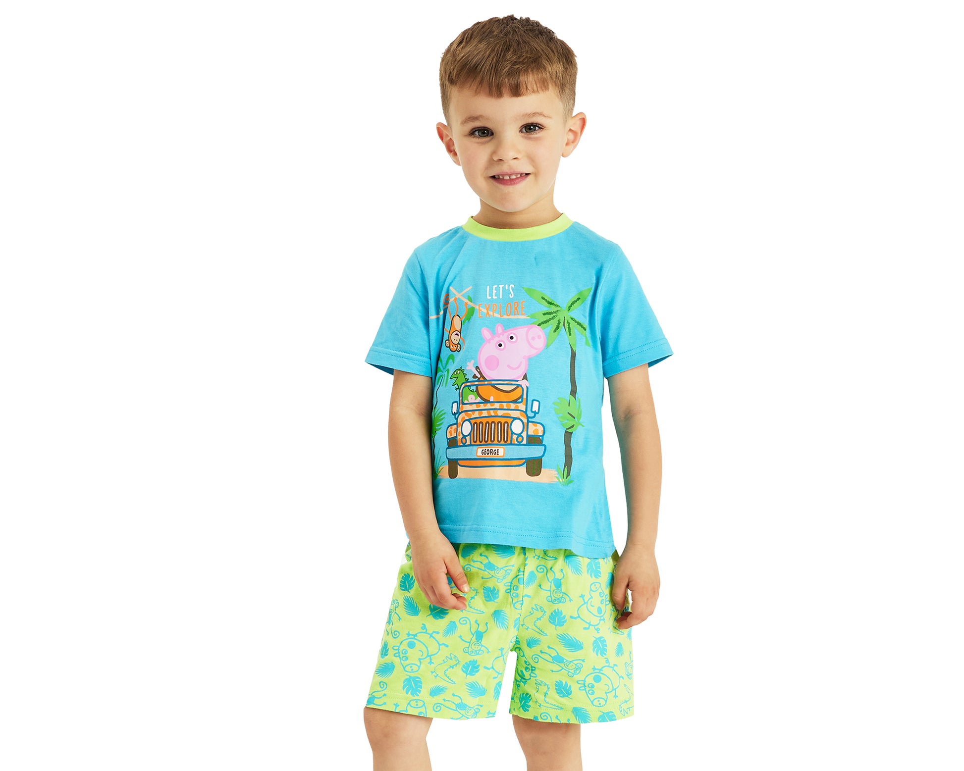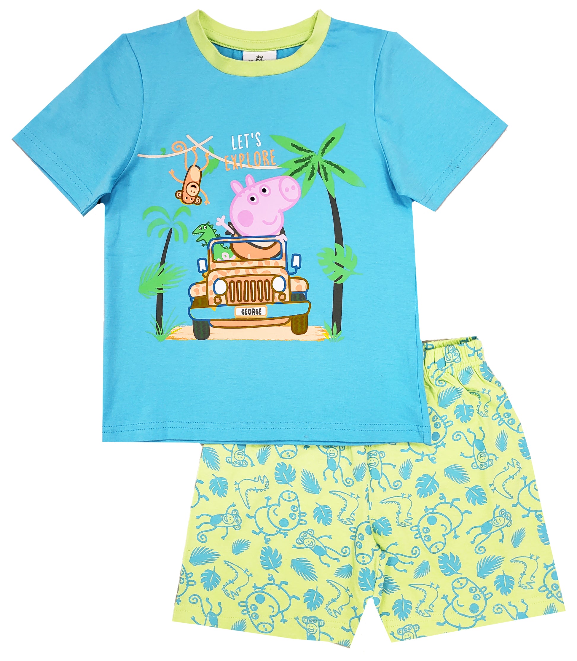 LOVELY GEORGE PIG DESIGN: The kids George Pig shorty PJs have a lovely short sleeved top, with cute pictures of George Pig in the jungle with his favourite Mr Dinosaur and a monkey swinging in the trees! The pyjamas come with short patterned, elasticated waist
