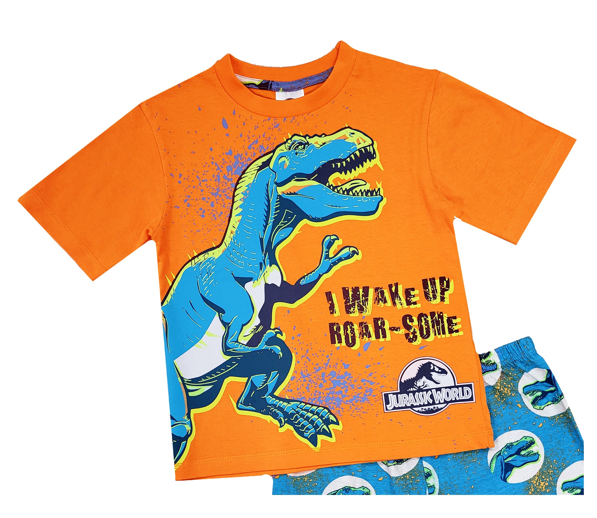 With a brightly coloured top with a Jurassic World dinosaur to the front and the slogan “ I Wake Up Roar-Some! “