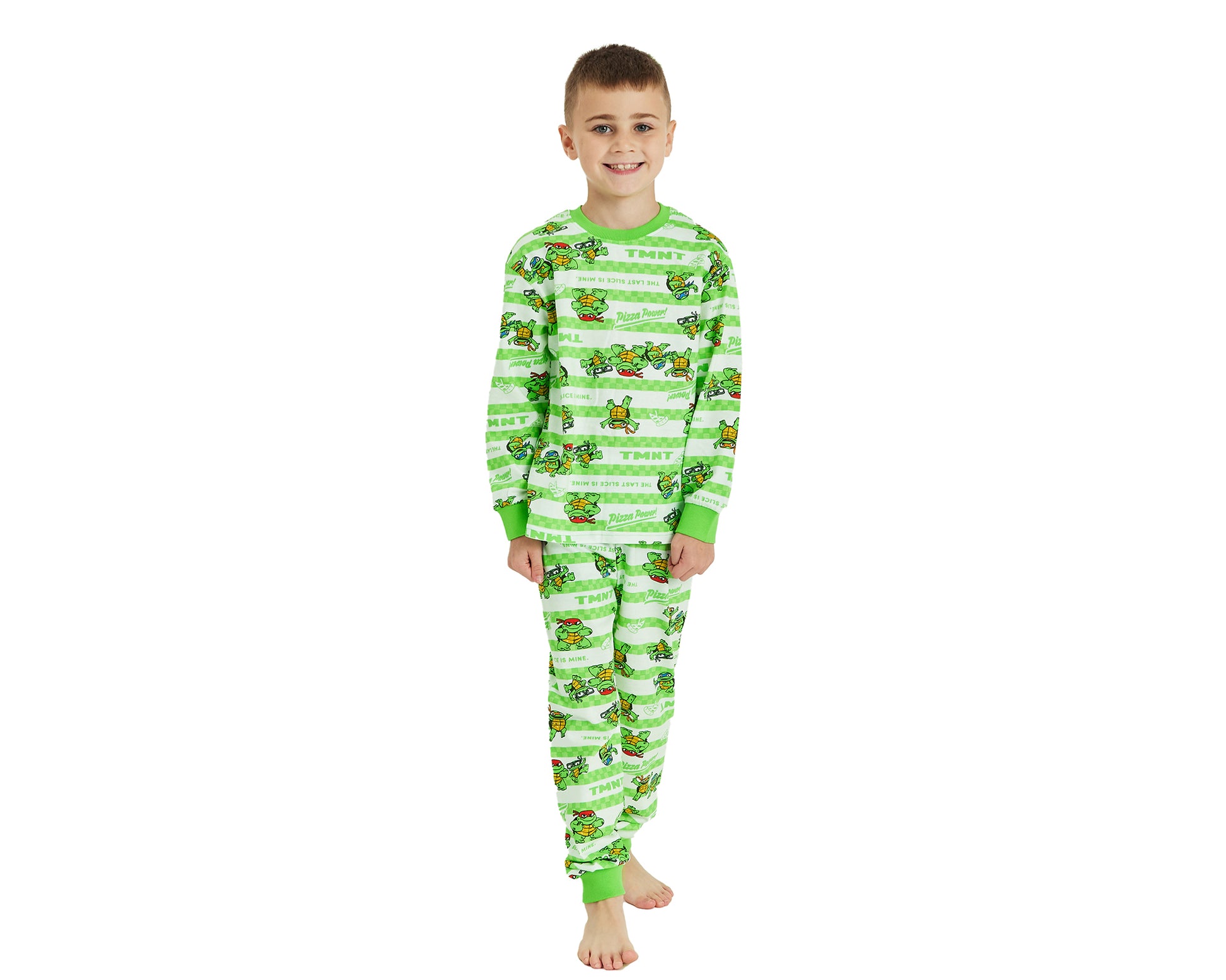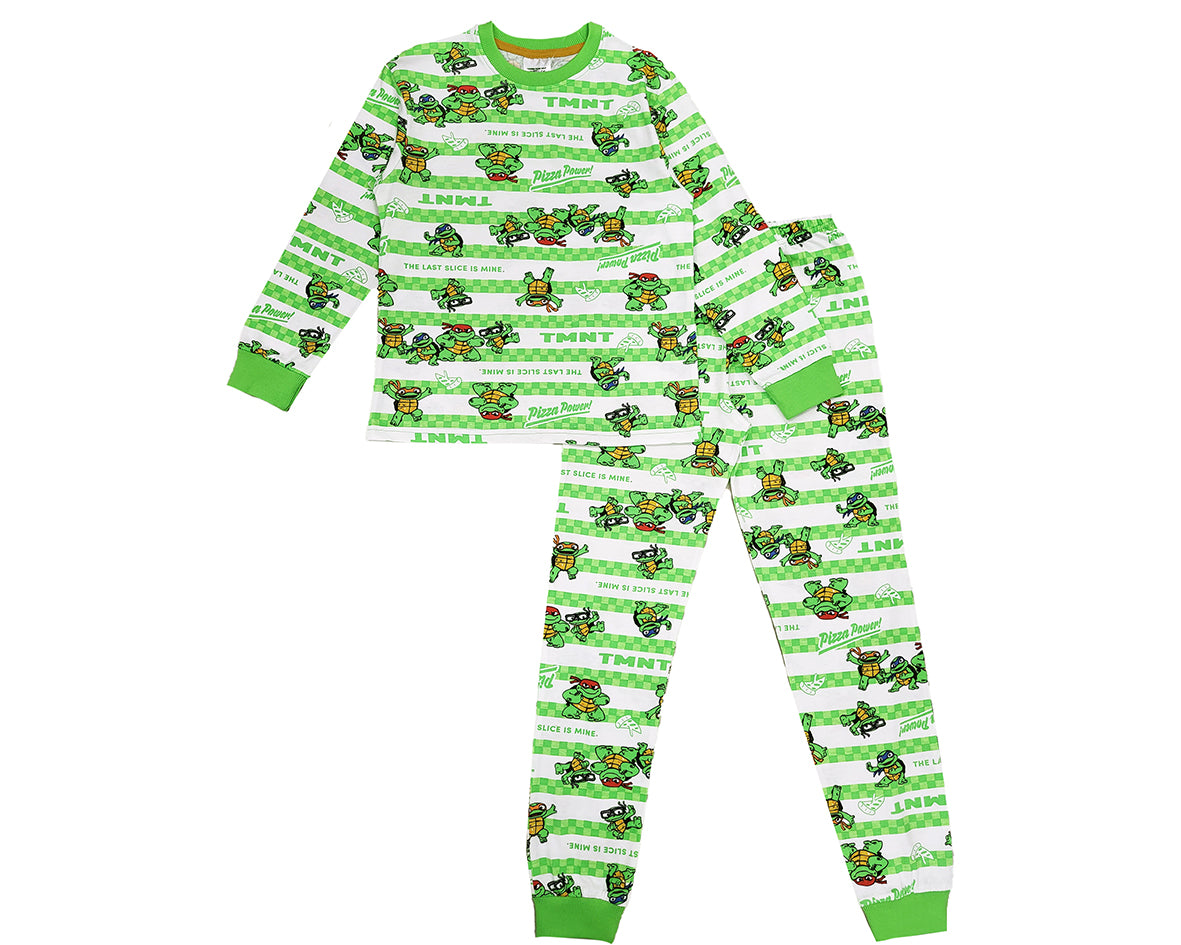 The TMNT pyjamas come with a long sleeved top with matching patterned, and elasticated waist bottoms. Featuring Teenage Mutant Ninja Turtles characters including Leonardo, Donatello, Raphael and Michelangelo.