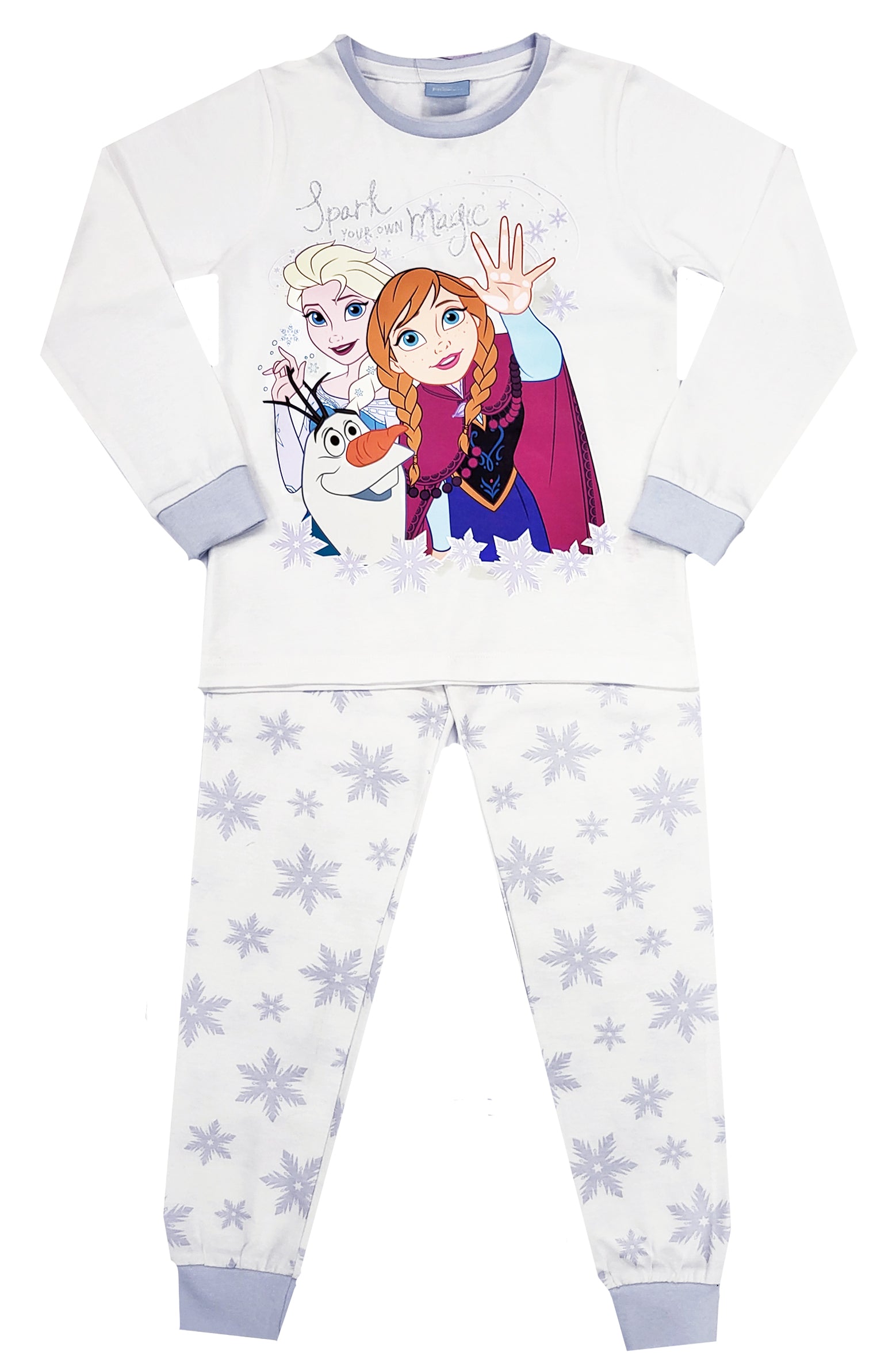 The kids Frozen pyjama set comes with a long sleeved top and matching patterned, elasticated waist bottoms. The Frozen top and bottoms come with sweet images of Elsa, Anna and Olaf characters and the words in glittery shimmer "Sparkle Your Own Magic".