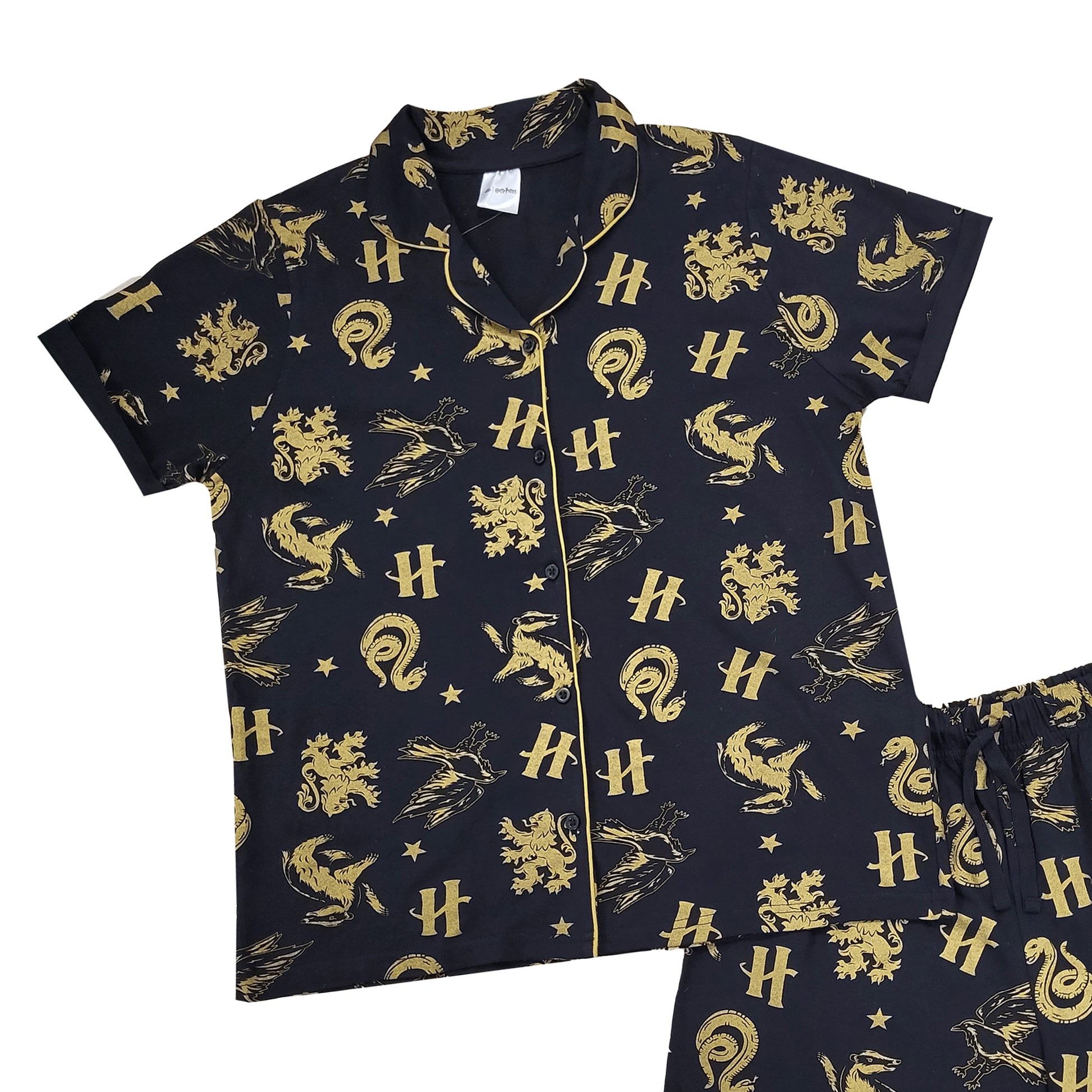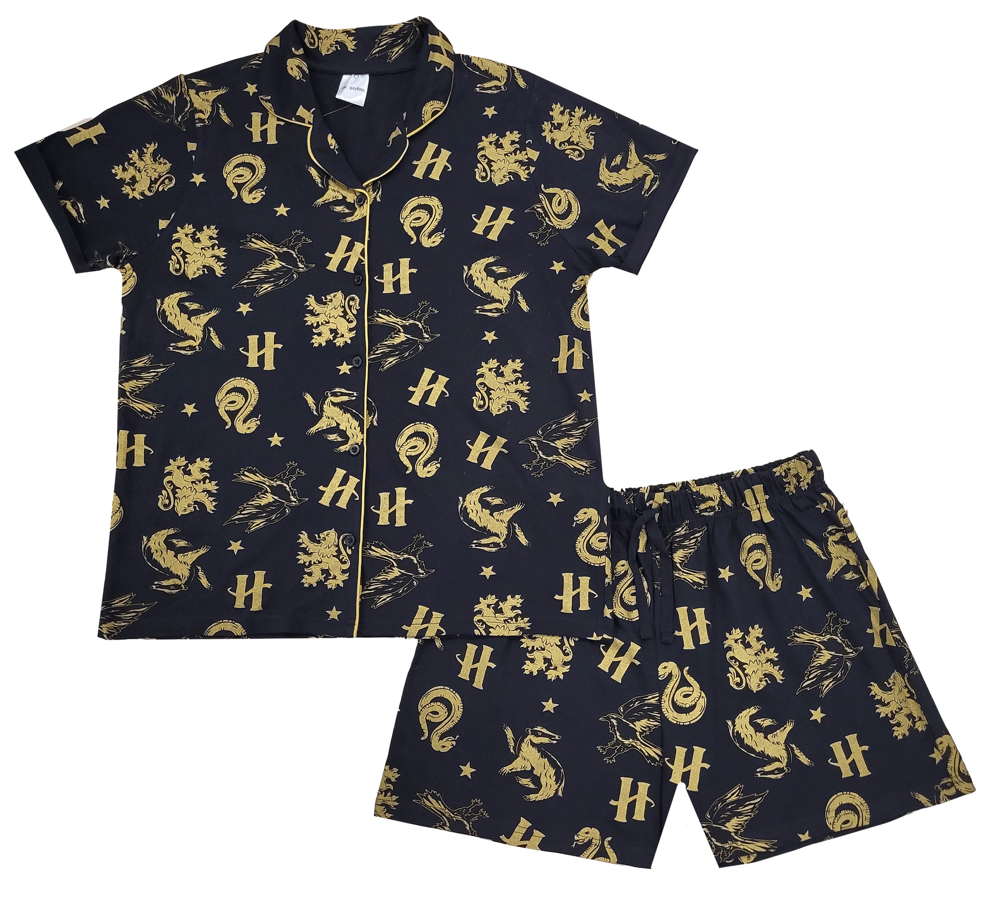 The ladies and girls Harry Potter pyjamas come with a short sleeved pyjama top with collar and button fastening to the front, and matching elasticated waist bottoms.