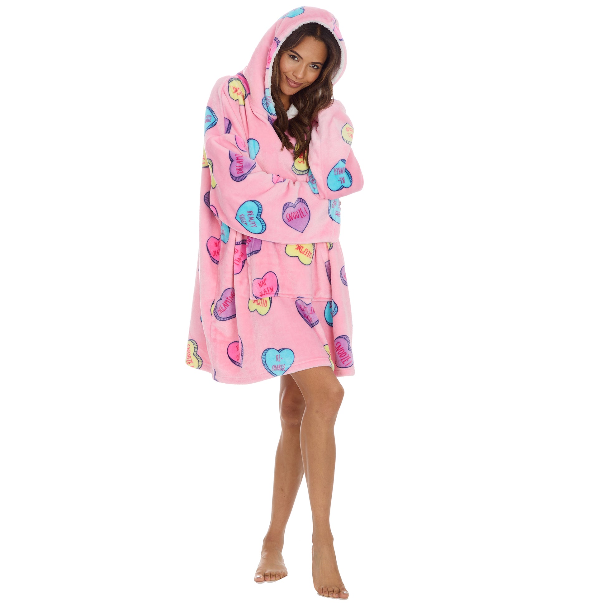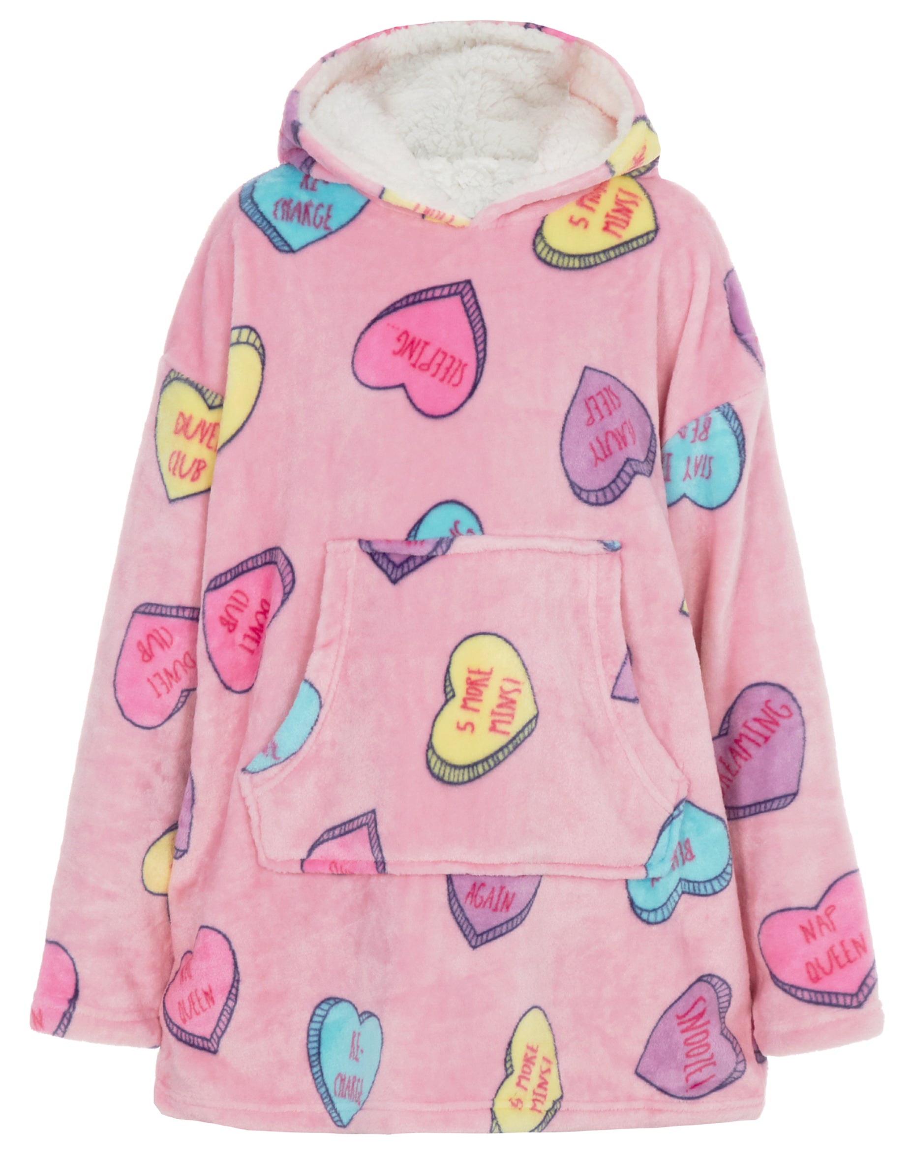 These oversized fleece hoodys come in a lovely pink colour with heart and slogans design throughout!