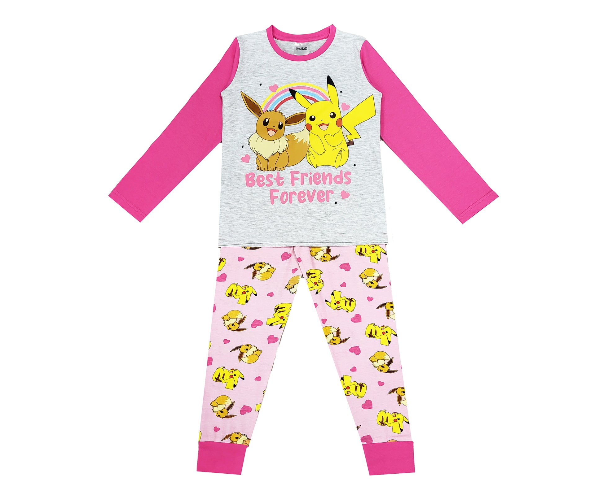 The Pokemon PJs come with a long sleeved pyjama top, featuring characters including Pikachu and Eevee. The girls Pokemon pjs come with patterned elasticated waist bottoms.