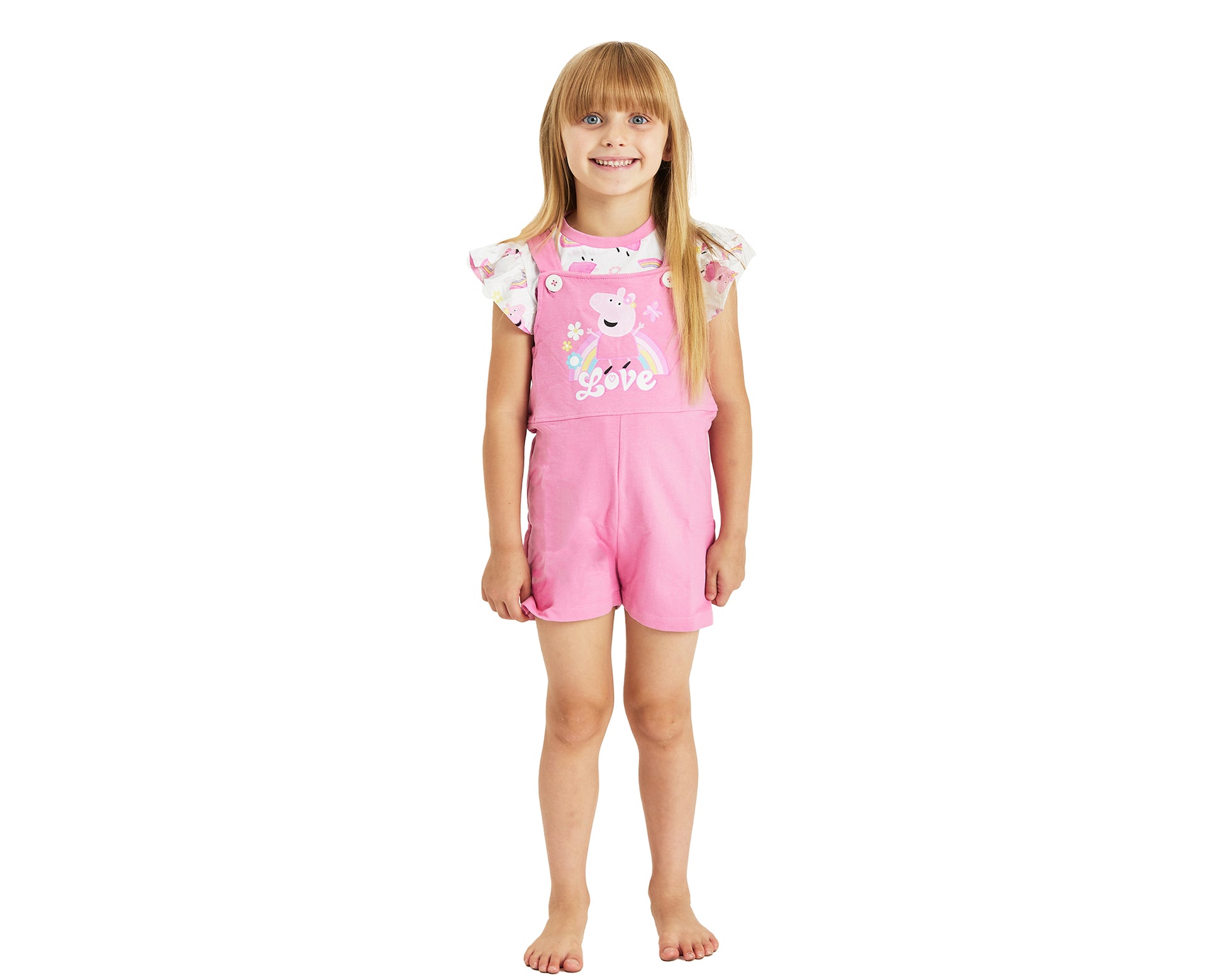 The Peppa Pig dungarees has Peppa Pig with the word "Love" to the front. The Peppa Pig top is short sleeved with ruffle feature, with Peppa Pig, rainbows, flowers and butterflies throughout.