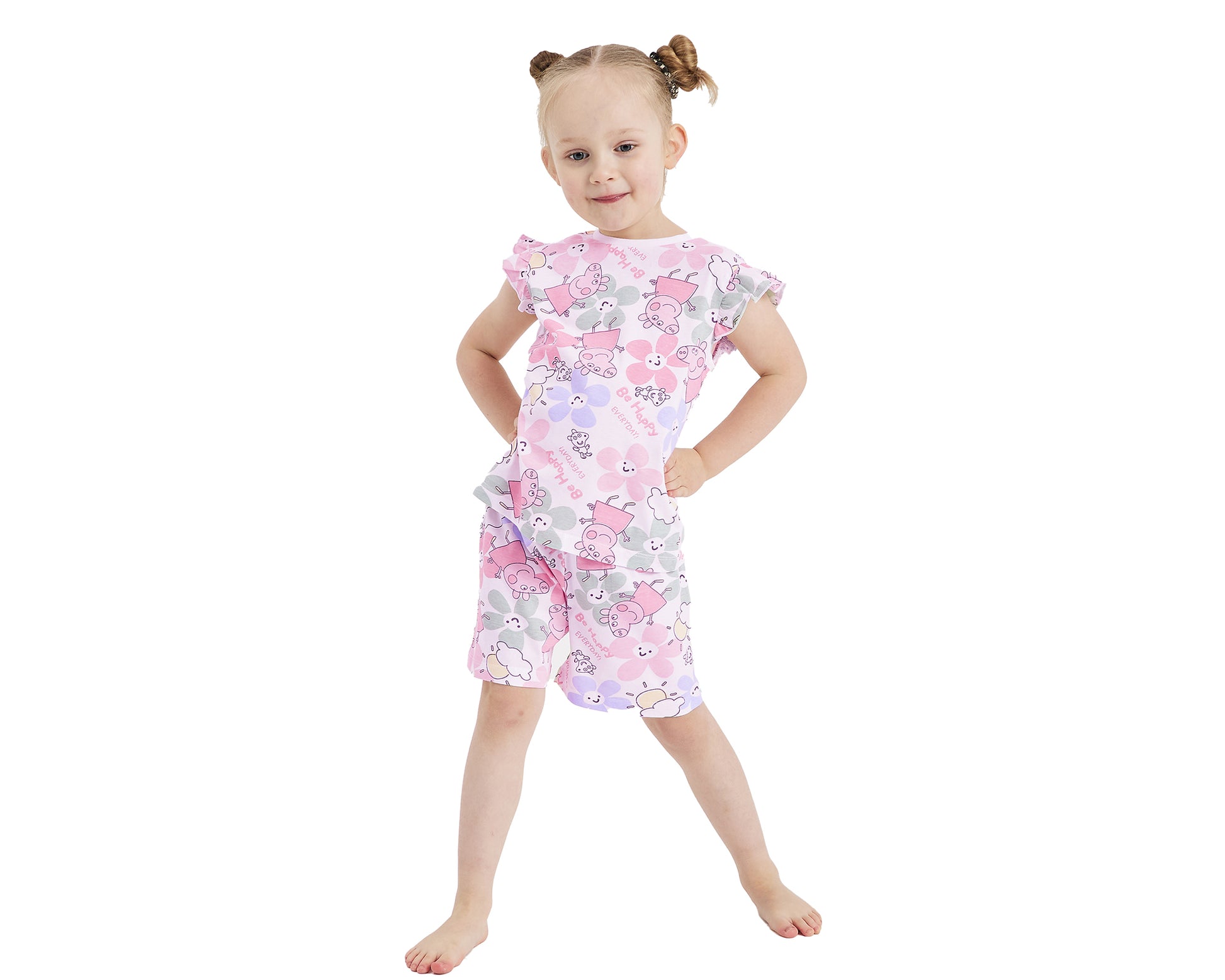 The kids Peppa Pig PJs have a lovely short sleeved top with cute frill detail to the sleeves. The flowery pyjama top has pictures of Peppa Pig and her favourite teddy with the slogan “Be Happy Everyday!”. The pyjamas come with matching, elasticated waist short bottoms.