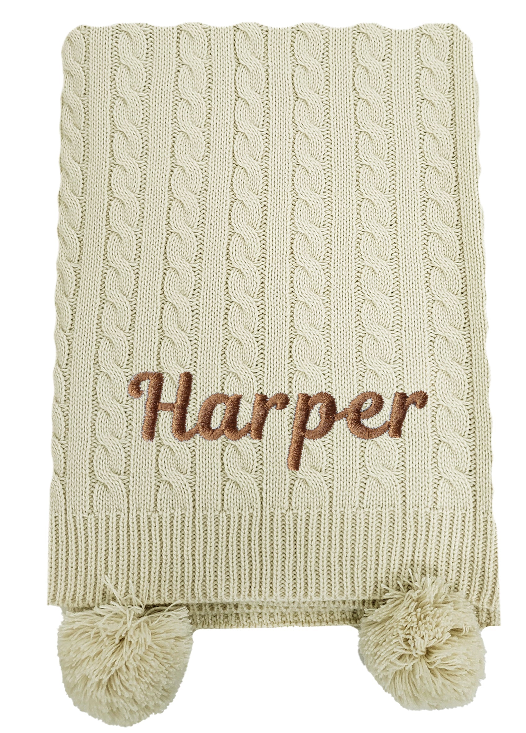 This is a gorgeous soft cable knitted pom pom in beige colour personalised baby blanket. The blanket has a lovely design of cable knitted which is compliment with poms poms on the corner.