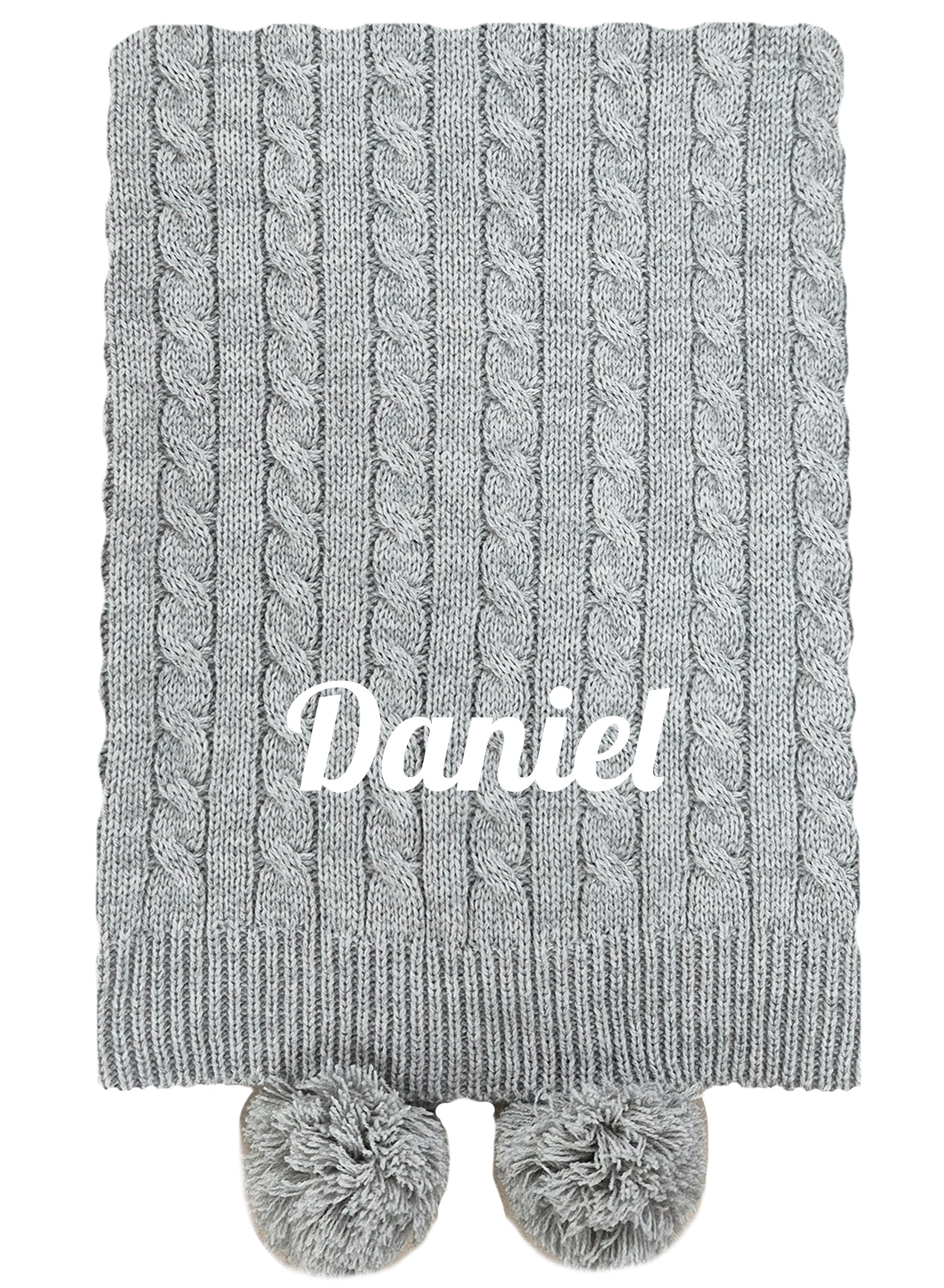 This is a gorgeous soft cable knitted pom pom in grey colour personalised baby blanket. The blanket has a lovely design of cable knitted which is compliment with poms poms on the corner.