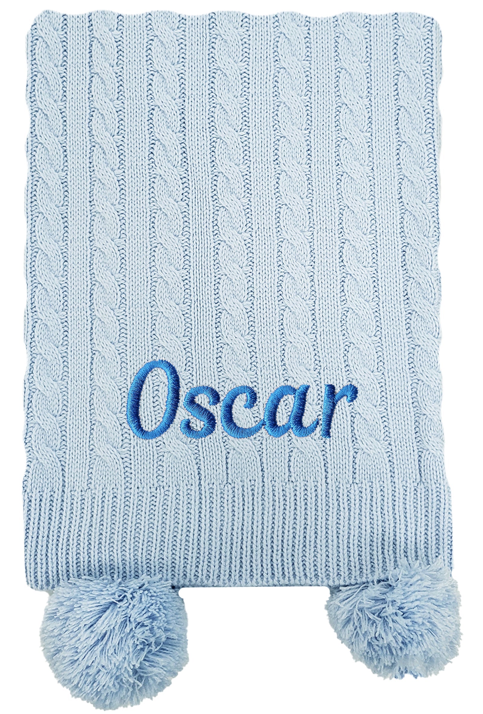 Personalised Baby Knitted Pom Pom Blanket - Light Blue