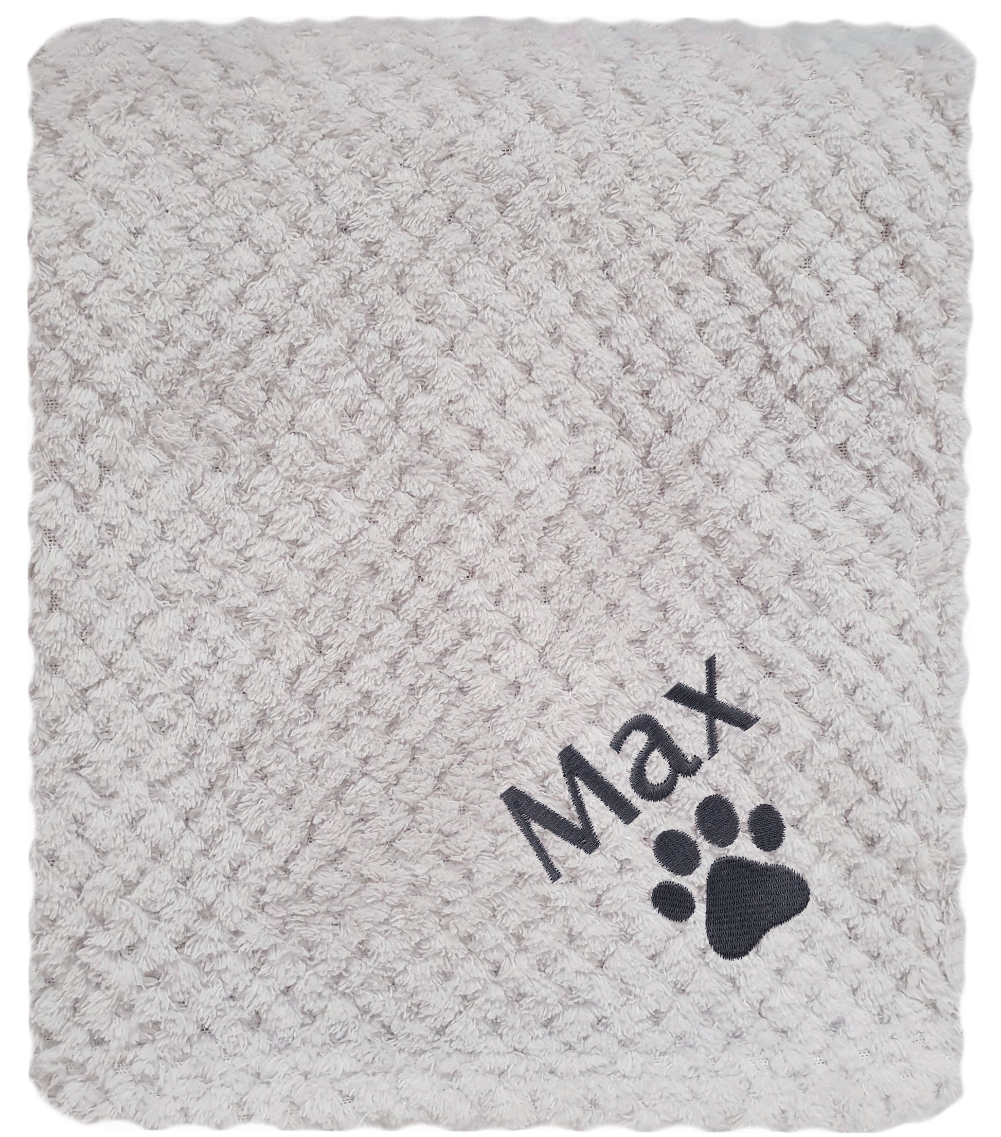 Your personalised dog or cat blanket will feature a grey embroidered paw print, placed below a pets name of your choice!