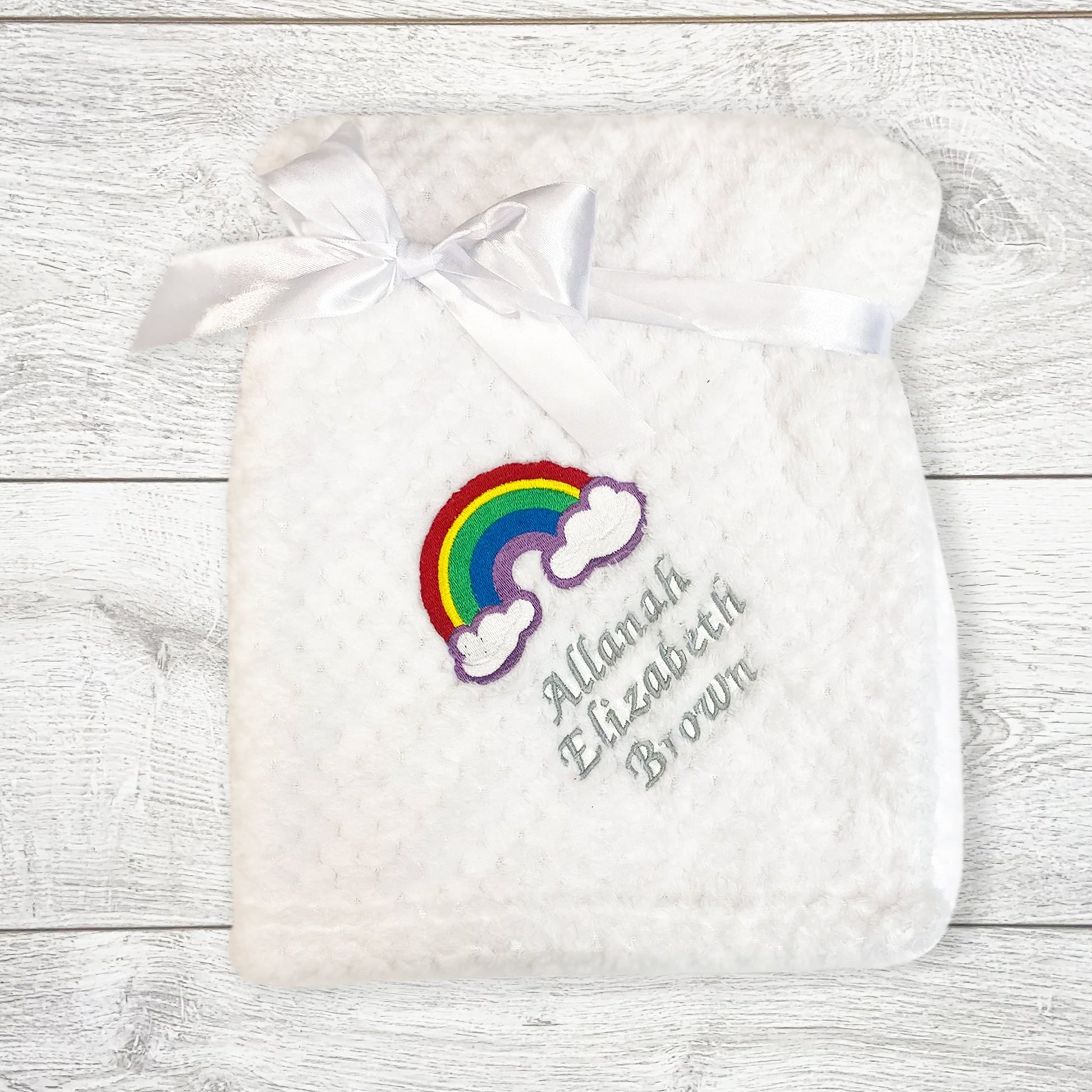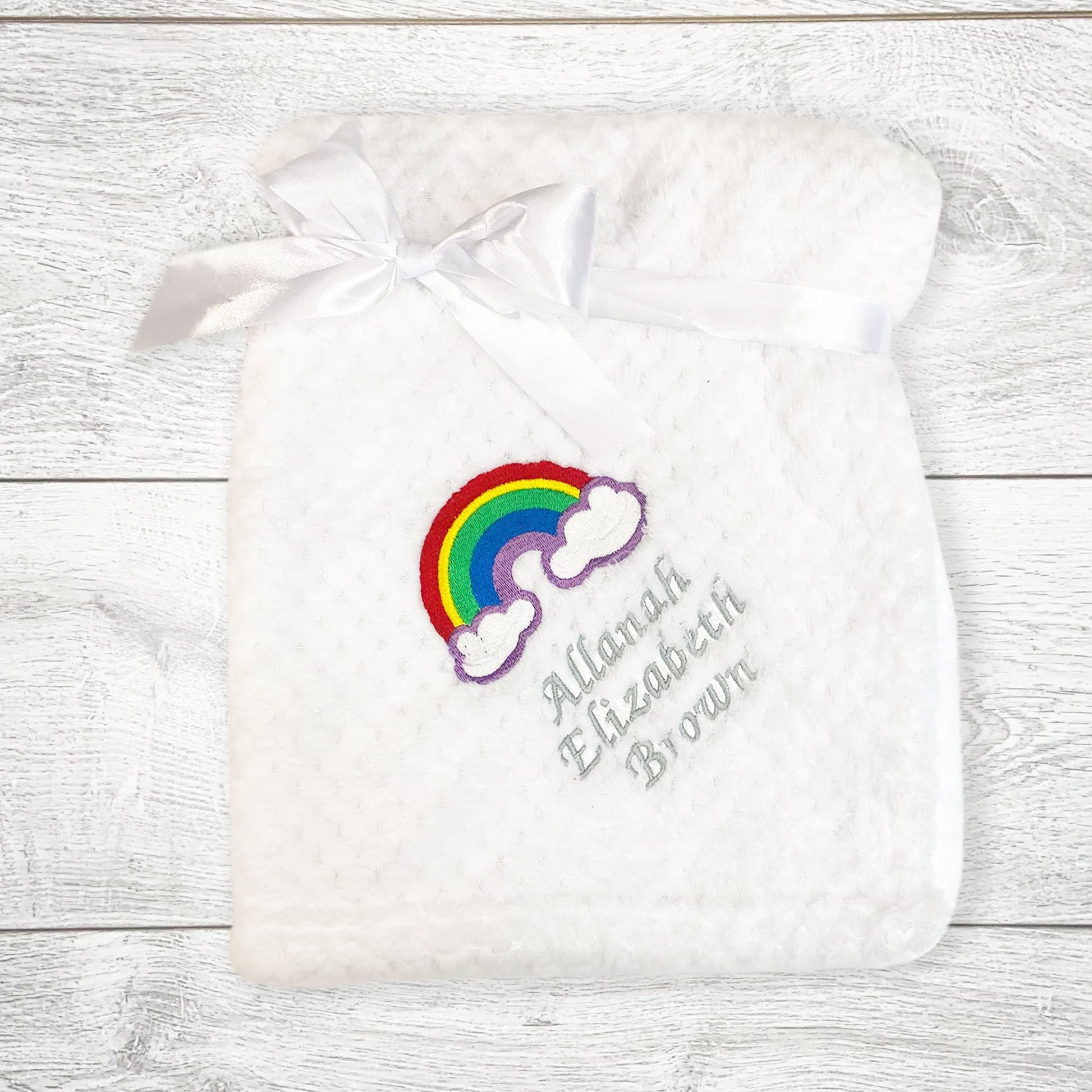 Our blanket is available in white only, but features an embroidered rainbow, as well as coming personalised with your little one's name.