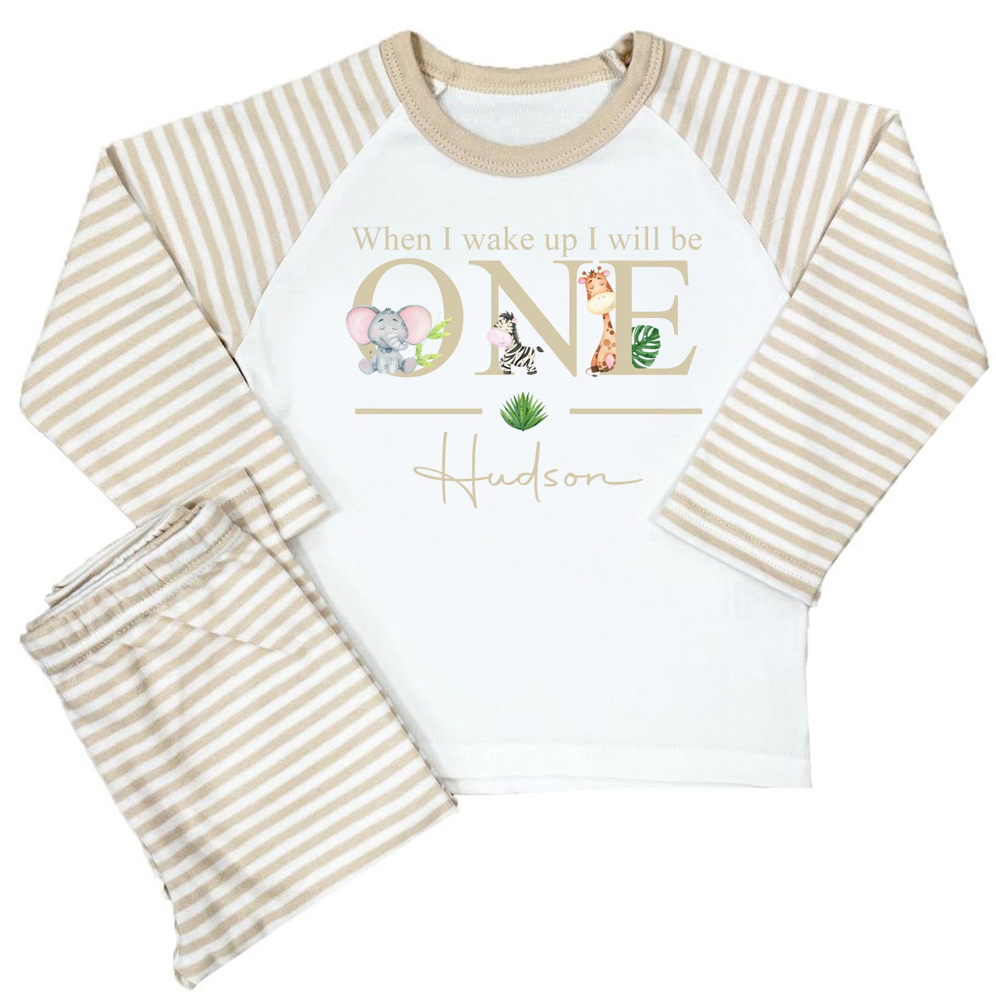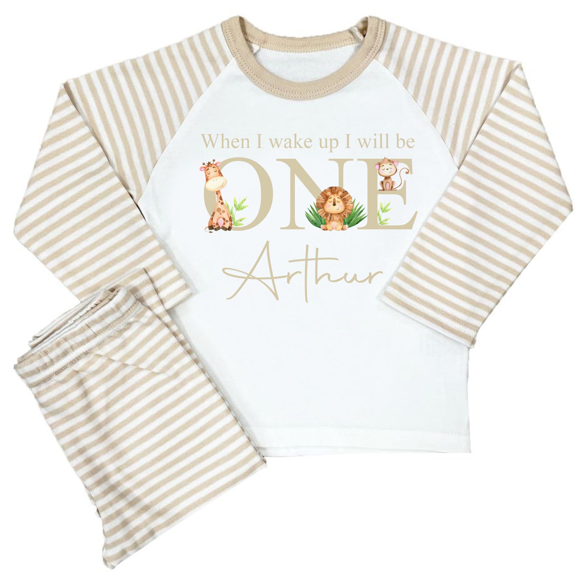 The safari pyjamas are available in 2 adorble designs, and feature beige striped pyjama set, personalised with the name and age.