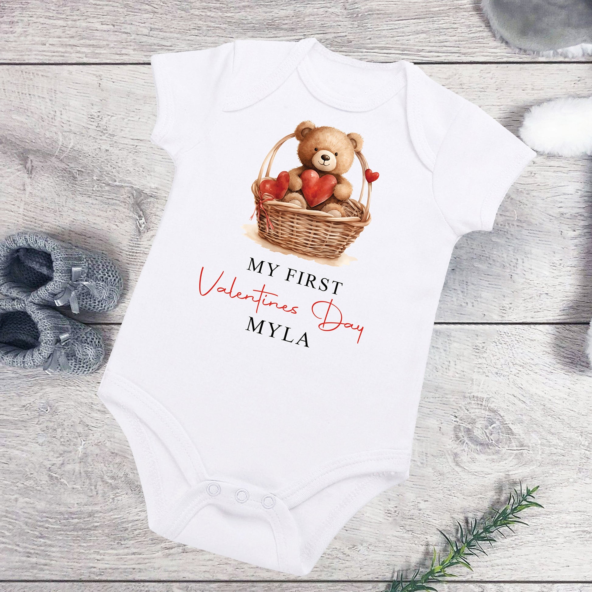 ADORABLE FIRST VALENTINES BABY BODYSUIT: Make Valentines Day extra special with our delightful Baby Personalised Valentines Bodysuit. Featuring adorable teddy bear designs with wording, these baby bodysuit vests bring joy and excitement to their first Valentines Day. The white Valentines bodysuits have a short sleeves, press stud poppers and envelope opening neck for ease of dressing. The baby bodysuits will be personalised with their name, making the bodysuits a unique and special gift.