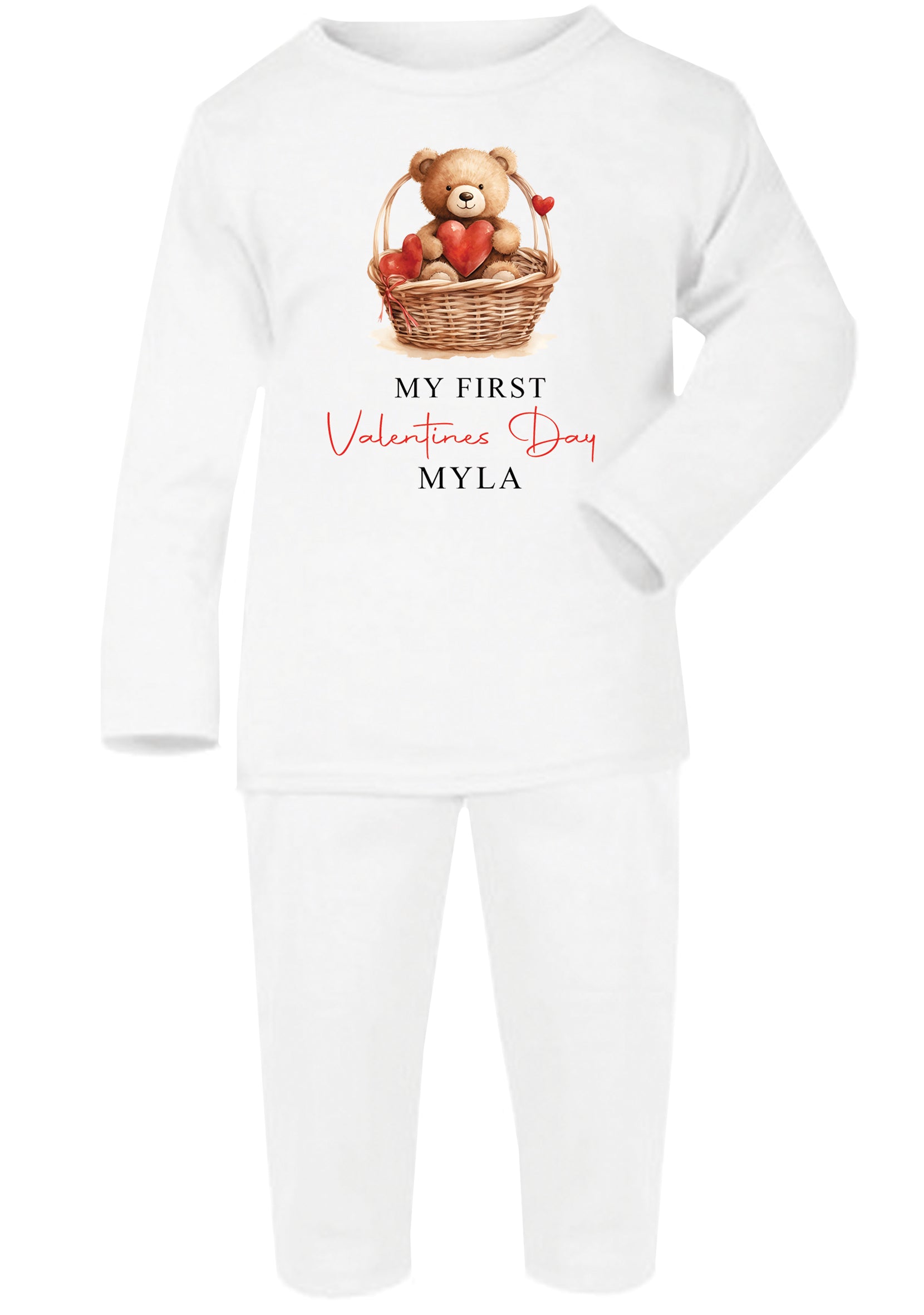ADORABLE FIRST VALENTINES BABY PYJAMAS: Make Valentines Day extra special with our delightful Baby Personalised Valentines Pyjamas. Featuring adorable teddy bear designs with wording, these baby pyjamas bring joy and excitement to their first Valentines Day. The white Valentines pyjamas are long sleeved, with matching pyjama bottoms. The baby pyjamas will be personalised with their name, making the pyjamas a unique and special gift.