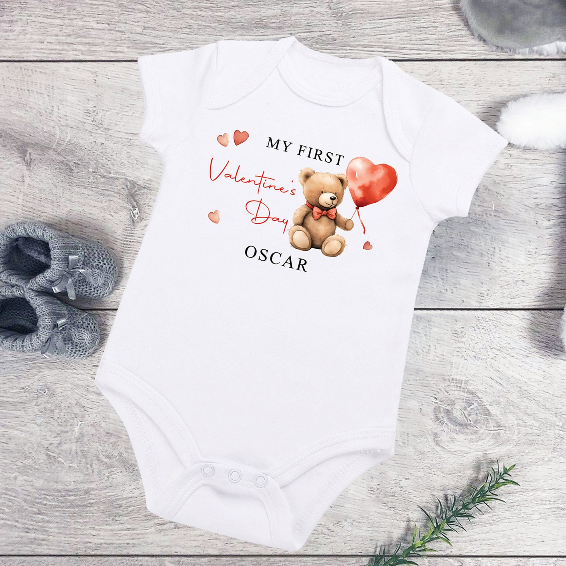ADORABLE FIRST VALENTINES BABY BODYSUIT: Make Valentines Day extra special with our delightful Baby Personalised Valentines Bodysuit. Featuring adorable teddy bear designs with wording, these baby bodysuit vests bring joy and excitement to their first Valentines Day. The white Valentines bodysuits have a short sleeves, press stud poppers and envelope opening neck for ease of dressing. The baby bodysuits will be personalised with their name, making the bodysuits a unique and special gift.