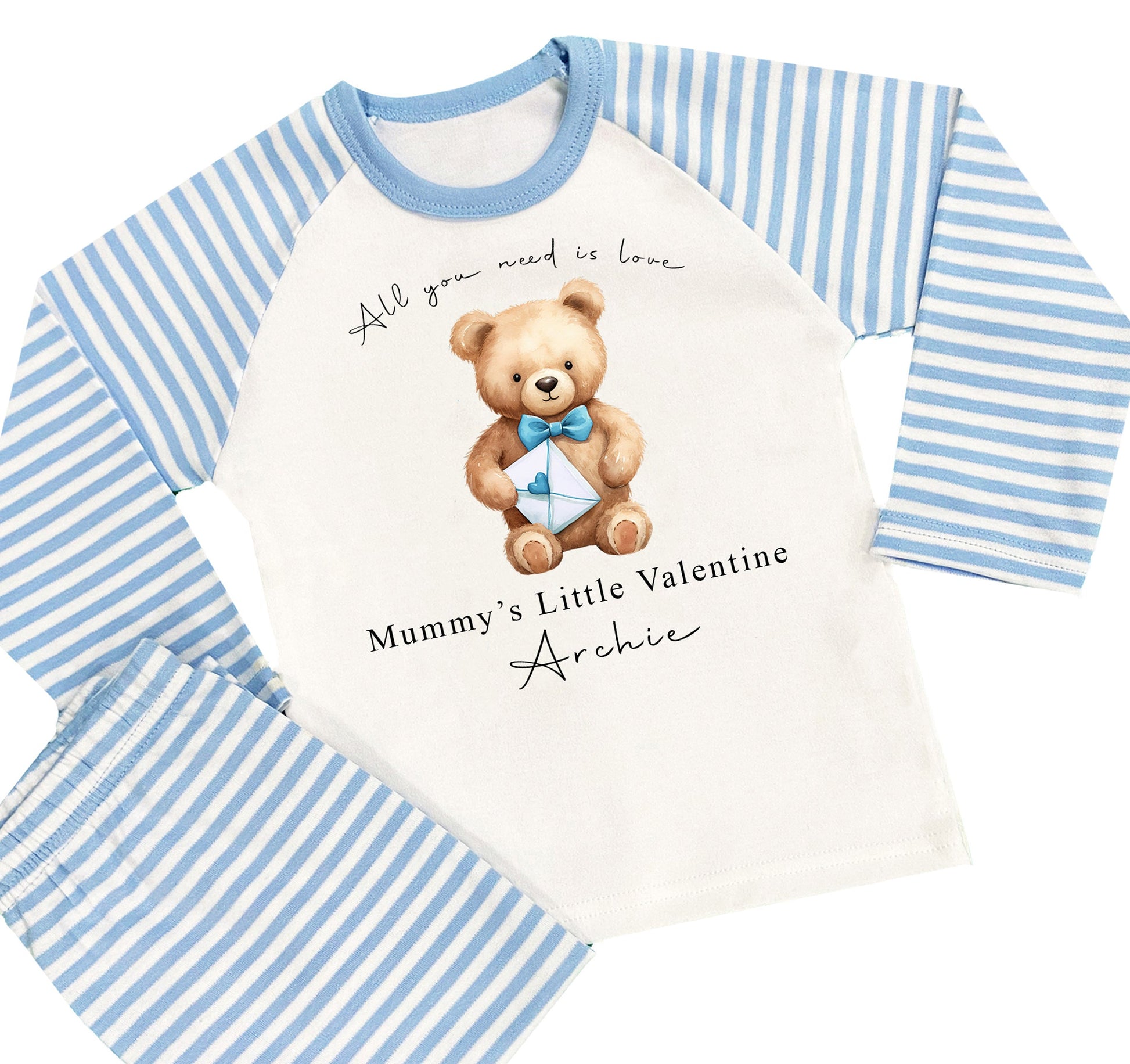ADORABLE VALENTINES PYJAMAS: Make Valentines Day extra special with our delightful Childrens Personalised Valentines Pyjamas. Featuring an adorable teddy bear design and wording, these pyjamas bring joy and excitement to their Valentines Day. The blue striped Valentines pyjamas have a long sleeved top and matching pyjama bottoms. The childrens pyjamas will be personalised with the childs name, making the pyjamas a unique and special gift.